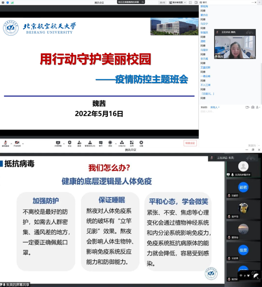 raybet雷竞技班主任、辅导员以“共克时艰,守护美丽校园”为主题面向学院全体学生召开班会,发出拒绝外卖、减少快递、守护美丽校园的倡议,将学校的暖心举措详细告知同学们。同学们纷纷表示,大爱暖心北航,要用行动守护美丽校园。